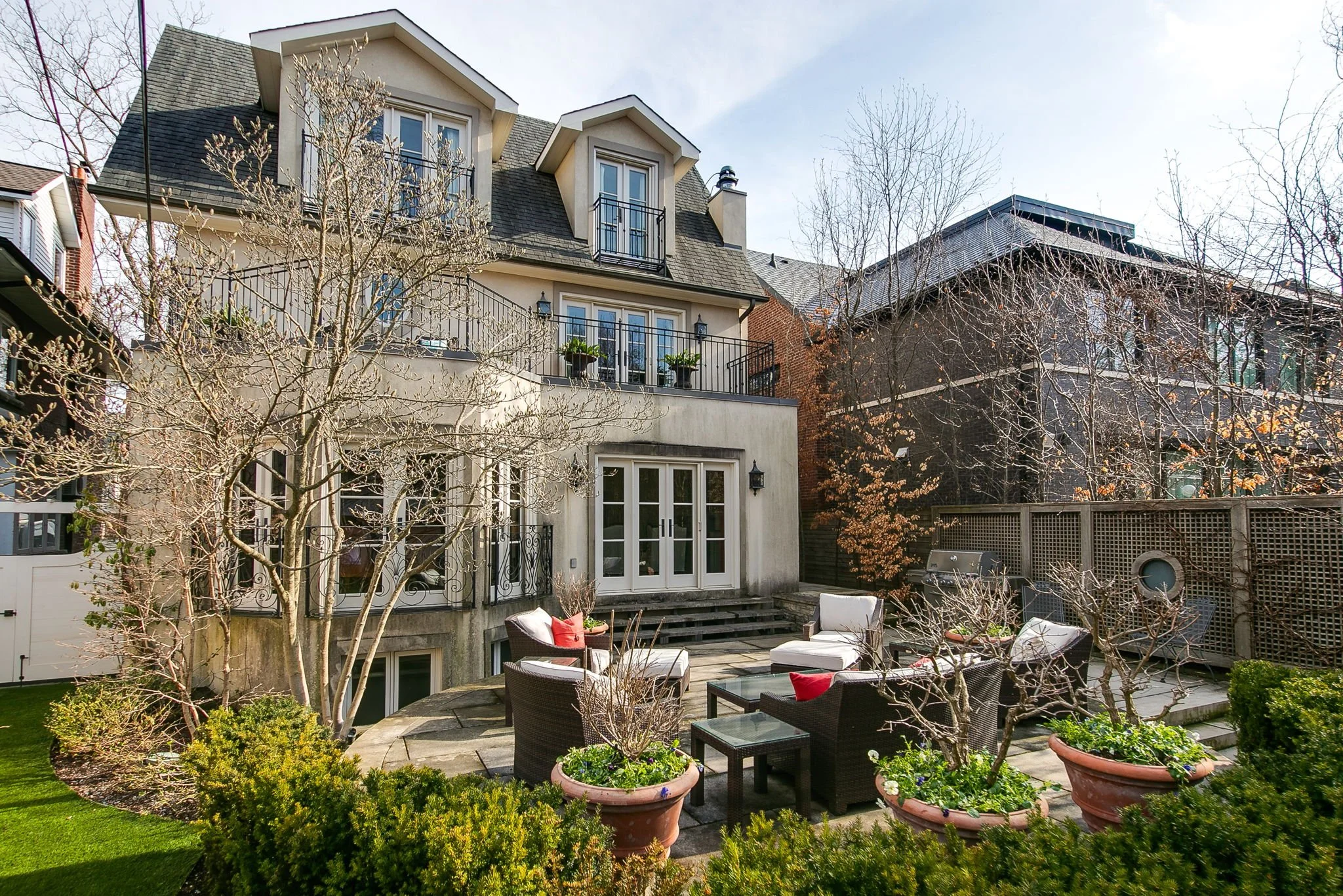 Step outside into your private, beautifully landscaped backyard by Janet Rosenberg—an entertainer’s dream with a flagstone patio with seating area, manicured grounds, artificial turf, accent lighting & mature trees lining the perimeter for privacy.